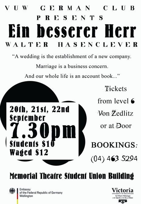 Die Victoria University hat einen “German Club”, der seit Donnerstag das Stueck “Ein besserer Herr” von Walter Hasenclever auffuehrt. Auf Deutsch, wohlgermerkt. Gemeinsam mit Thomas und Hannah (die ja gerade fleissig an der Wellington High School Deutsch lernt) haben wir uns das Schauspiel angesehen. Ich kenne zwar das Original nicht, aber anscheinend war das Werk schon sehr auf die heutige Zeit getrimmt und es hat wirklich Spass gemacht zuzuschauen. Die Studenten haben wirklich alles gegeben, und auch wenn manche durch ihren englischen Akzent schwer zu verstehen waren, hat es uns super gefallen.